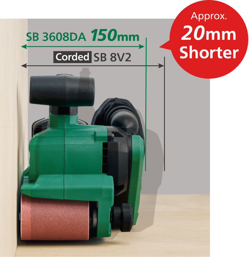 The compact design with an overall width 20 mm shorter than its corded predecessor improves the left-and-right weight distribution, resulting in better maneuverability. The SB3608DA is also just as easy to sand edges with.